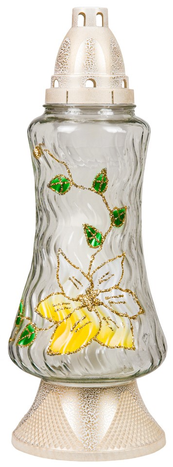 Każdy znicz jest ręcznie malowany, co nadaje mu elegancki wygląd i subtelny blask. Trwałe szkło oraz wysokiej jakości farby gwarantują odporność na warunki atmosferyczne, dzięki czemu znicz zachowuje swój wygląd na długi czas.