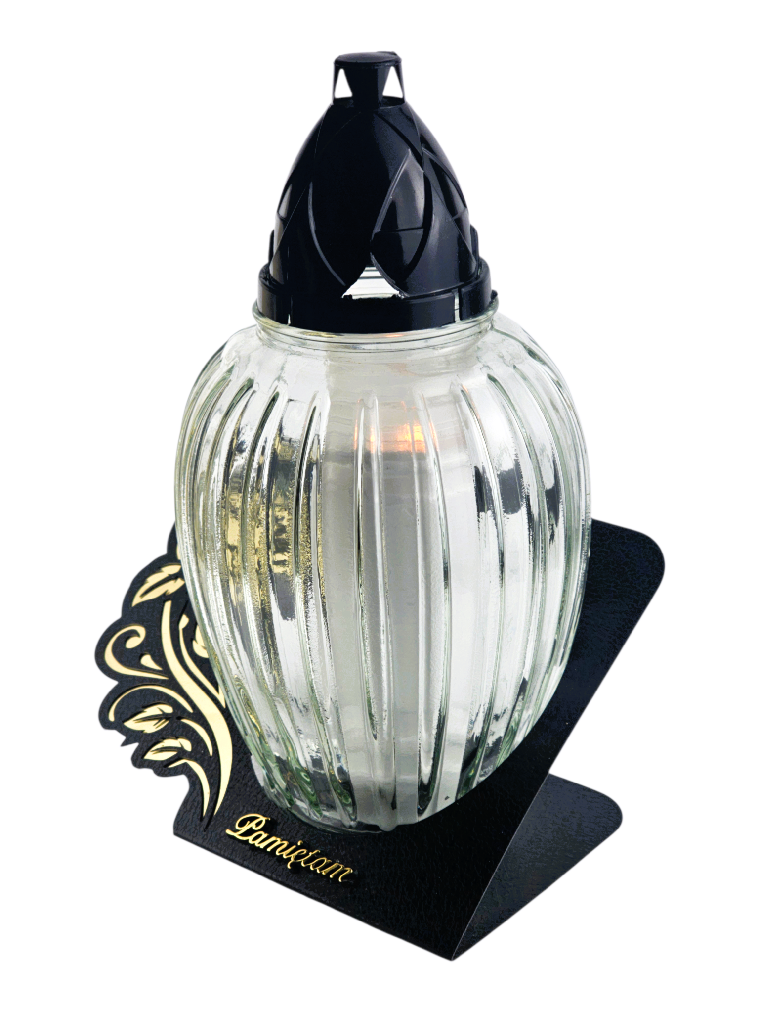 Starannie wykonana metalowa podstawa, wzbogacona dekoracyjnymi detalami, nadaje zniczowi wyrazistości i elegancji, jednocześnie zapewniając stabilność i trwałość. Szklany klosz, dostępny w różnych wariantach wykończenia, subtelnie rozprasza światło, tworząc spokojny i dostojny efekt.